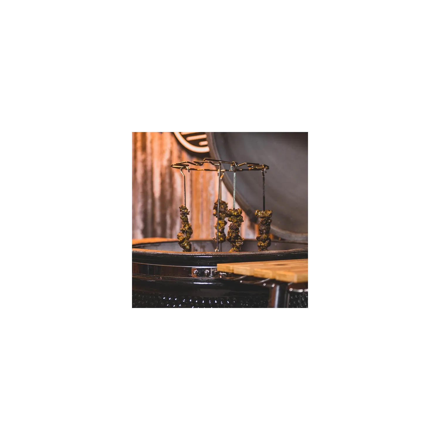 Il set Tandoori di YAKINIKU è progettato per consentire agli ingredienti di essere appesi al centro del supporto, esponendoli in modo uniforme al calore del barbecue Kamado. Ciò garantisce un processo di cottura uniforme, che cuoce perfettamente tutti i lati degli ingredienti. Ciò è particolarmente importante per i piatti delicati che necessitano di una temperatura uniforme per evitare l'essiccazione o una cottura non uniforme.