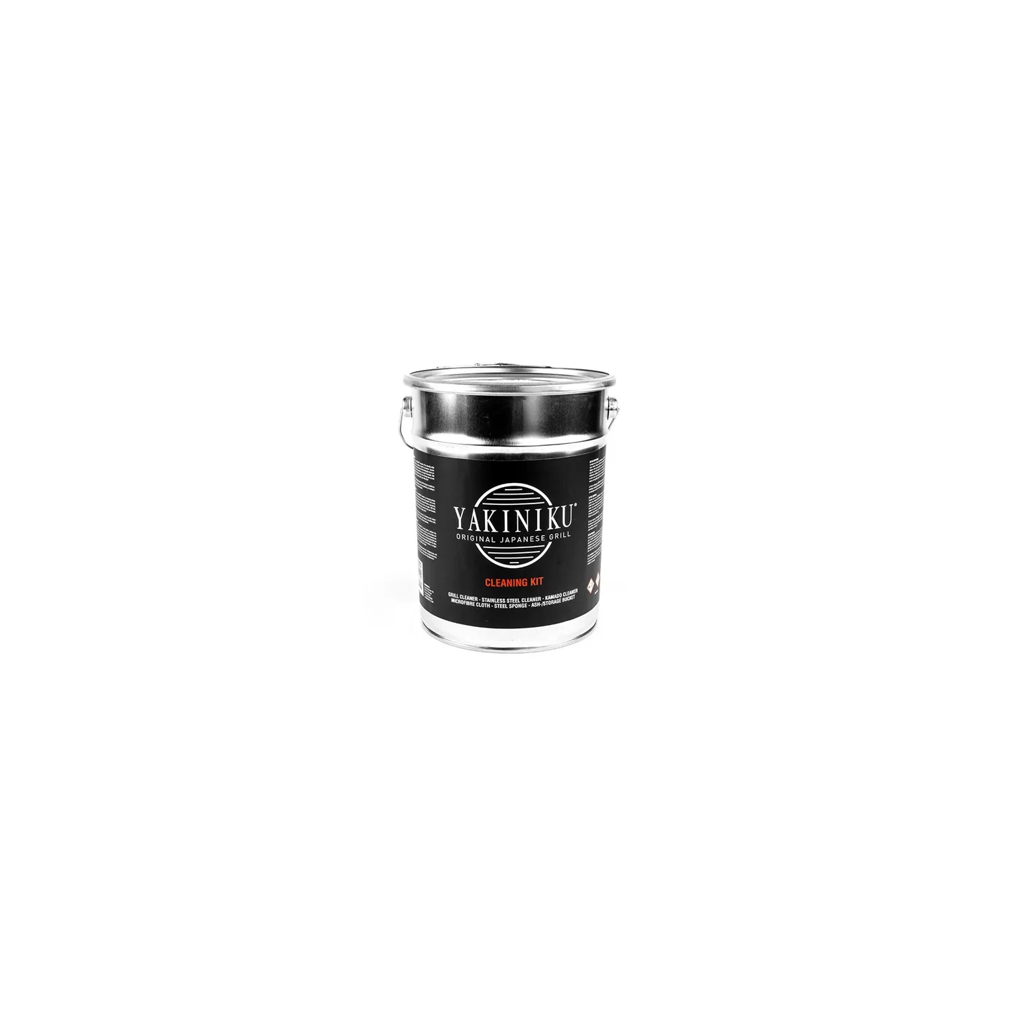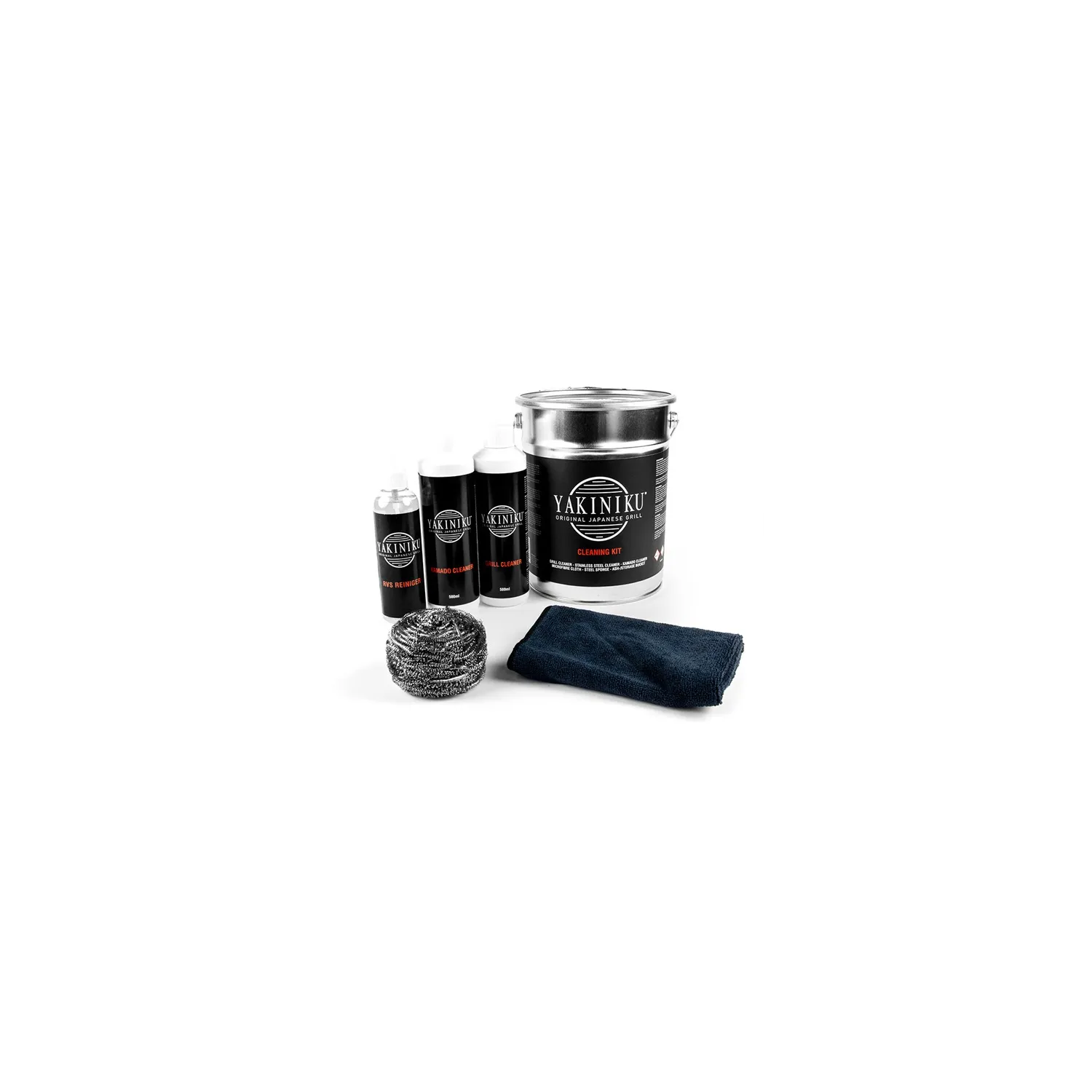 Il Kit YAKINIKU® Pulizia è composto da: - Detergente per acciaio inox e per Manutenzione - Detergente Kamado - Detergente per griglia - Panno in microfibra - Spugna in acciaio - Secchio per residui di carbone.