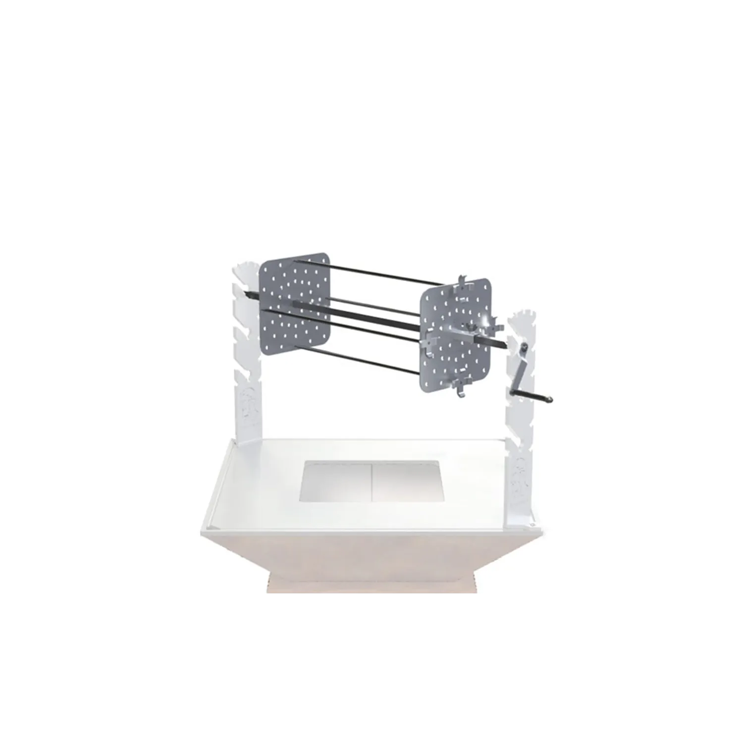 L'assemblaggio è completato da due piastre di pressione con oltre cinquanta posizioni e quattro spiedi, per la massima variabilità nella fornitura di materie prime. Il gruppo è dotato di serie di una manovella che può essere bloccata in sei posizioni o sostituita con un motore (accessorio) in pochi secondi. Le gambe principali del girarrosto sono munite di posizioni predisposte per aggiungere il sistema di grigliatura ASADO o i supporti dello spiedo per tagliare la carne.