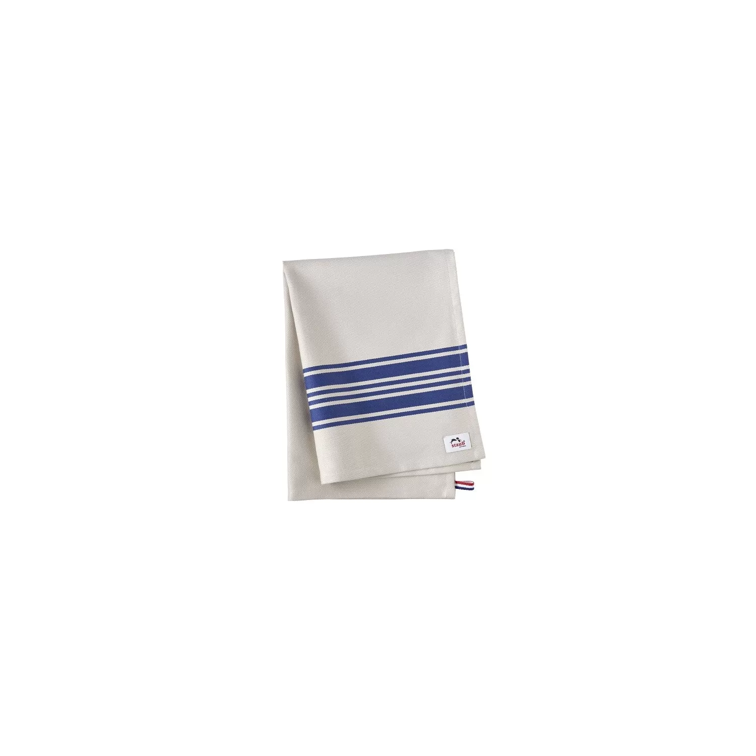 Il nuovo strofinaccio da cucina STAUB, come ogni altro prodotto a marchio STAUB, soddisfa le più alte aspettative verso un utensile da cucina. È stato cucito per unelevata durabilità su tutti e quattro i lati e subisce un processo di lavorazione di elevata qualità. Dalle dimensioni di 50 cm x 70 cm e dotato di uno stabile laccetto, lo strofinaccio fortemente assorbente soddisfa i requisiti funzionali dei cuochi professionisti. Le capacità di impiego di uno strofinaccio da cucina non conoscono confini. Dallasciugatura alla pulizia di stoviglie e posate, fino al lavaggio del piano di lavoro: un assistente sempre al tuo fianco, questo adorato pezzo di stoffa si merita il posto fisso sulla tua spalla o sulla tua cintura. Ovviamente un tessuto, in una cucina di un certo livello, assume anche una funzione decorativa: il design senza tempo vive del magnifico contrasto delle 6 righe in blu poste sullo sfondo bianco naturale. Non mancano i colori della bandiera francese, infatti li troviamo in un piccolo passante sull'orlo cucito. Una discreta etichetta STAUB dimostra che lo strofinaccio è un prodotto di marca.