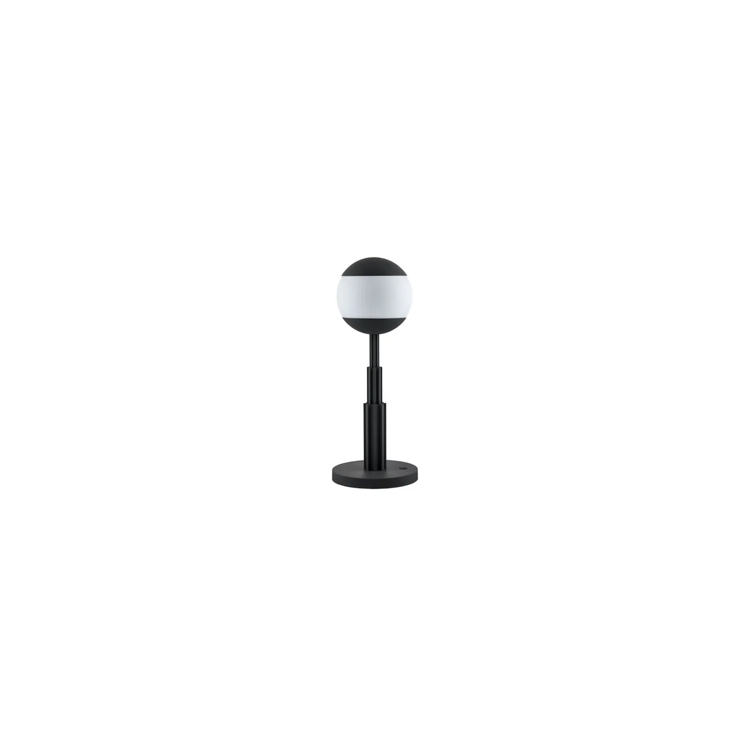 Lampada da tavolo in alluminio colorato, nero e sfera in vetro. Batteria ricaricabile e touch dimmer. Luce a LED 5W 5V. Adattatore con spine intercambiabili.