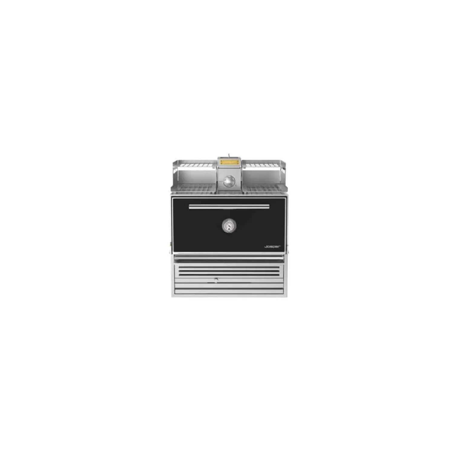 Forno Josper da appoggio a carbone di legna, con struttura portateglie superiore e cassetto per cenere, costruzione in acciaio inox.