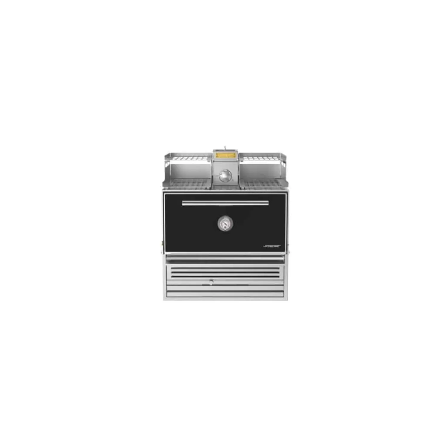 Forno Josper da appoggio a carbone di legna, con struttura portateglie superiore e cassetto per cenere, costruzione in acciaio inox.