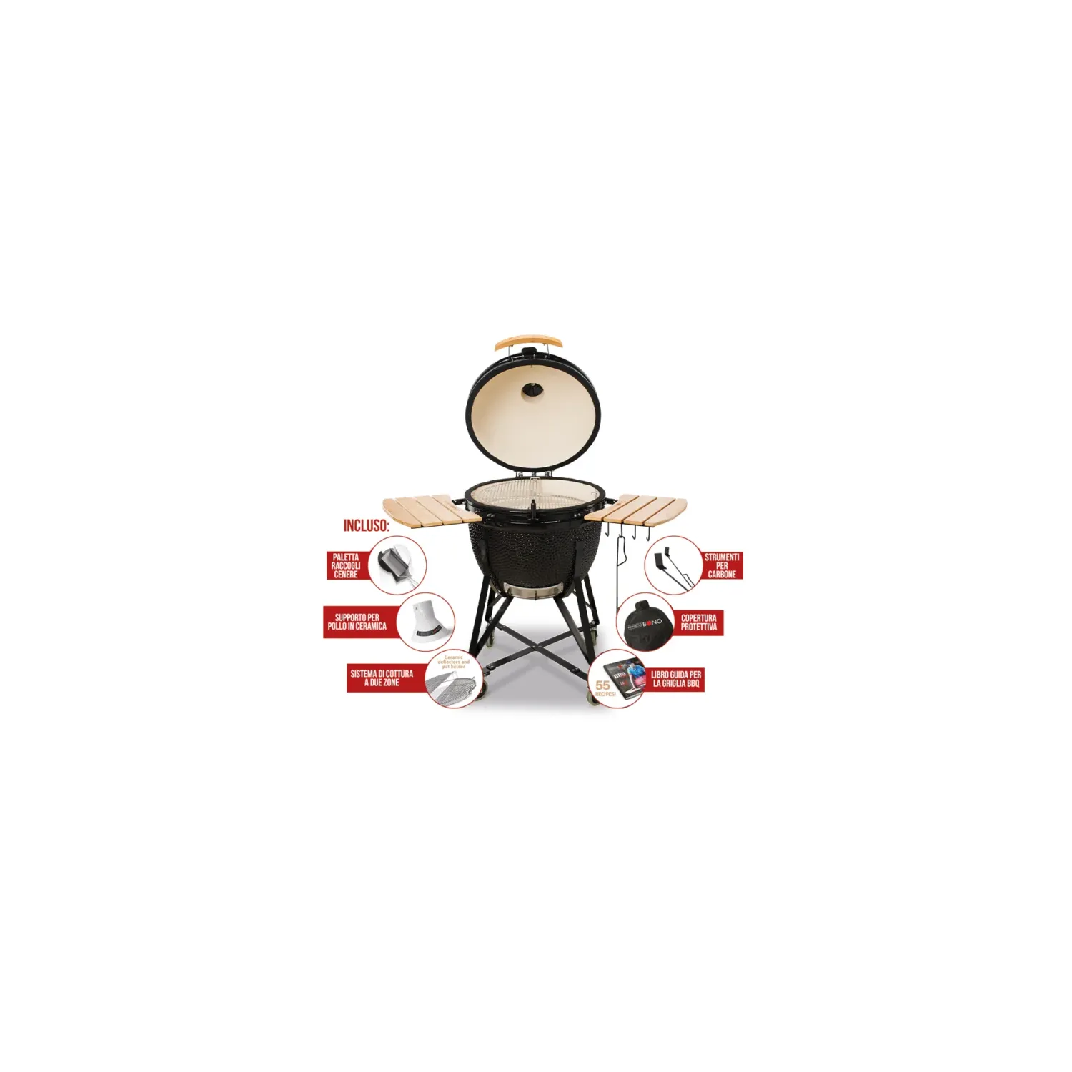 lIMITED Il modello più grande progettato per grandi feste (15 o più persone). È anche perfetto per l'uso in ristoranti e bar. Questa griglia è economica, consuma poco carbone e la temperatura di cottura è facile da gestire. Ha tutte le funzioni del modello Bono media ma con una capacità maggiore. La grande griglia può ospitare 40 hamburger, 4 spalle di maiale, 8 polli, un tacchino di 16kg, 20 bistecche o una pizza di 50 cm di diametro. Questo modello consente di godere di tutti i vantaggi dei dispositivi Kamado Bono in quanto è compatibile con tutti gli accessori fornendo il massimo della performance in termini di capienza. Hai voglia di affumicare del pesce, cuocere del pane o arrostire della carne? Kamado Bono GRANDE LIMITED è un must-have a casa o per il catering.