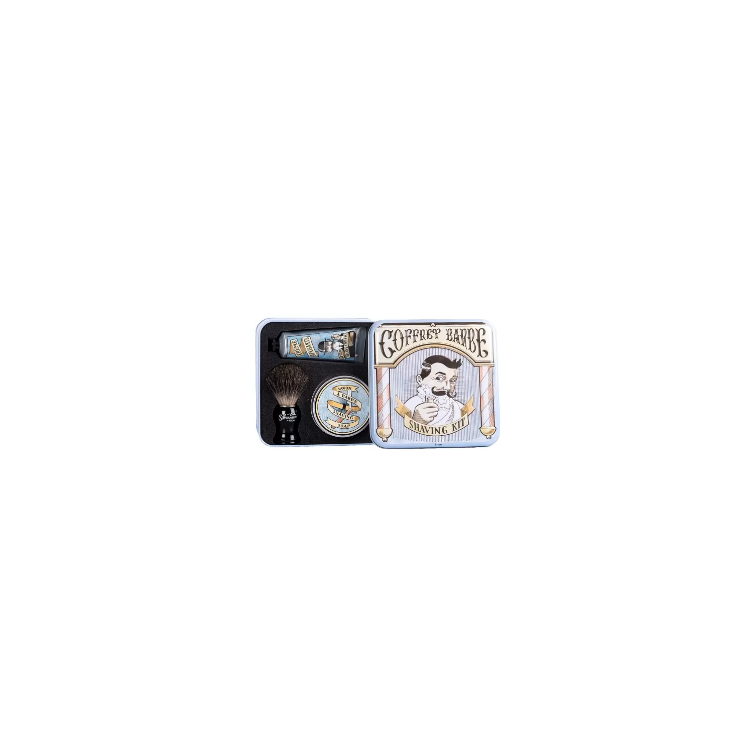 Questo kit offre tutto il necessario per una rasatura perfetta. Ideale come regalo, questa scatola decorata da Luc MAZAN, un pittore di Nyons, renderà felici le persone.
