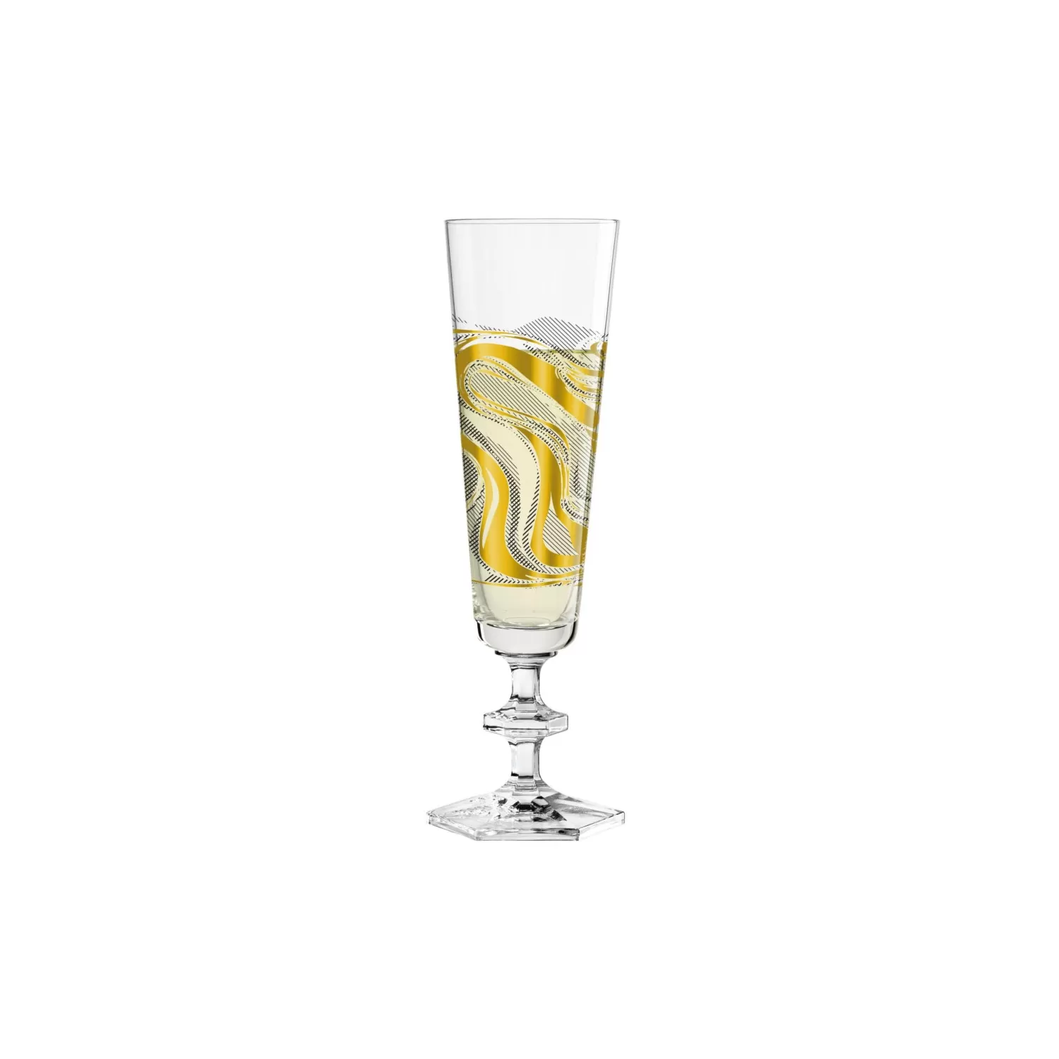 Il nuovo bicchiere per champagne sostituisce il suo predecessore degli anni '90 sia nella forma che nel colore, e attraverso il suo stile ed eleganza ridefiniti. Lo stelo esagonale perfettamente progettato riecheggia i classici sentimenti del vetro cristallino mentre i primi otto decori in nero lucido con inserti in oro e platino rispecchiano l'esclusività della bevanda all'interno. Questo vetro è caratteristico del design Ritzenhoff puro, elegante e di alta classe - e niente di meno.