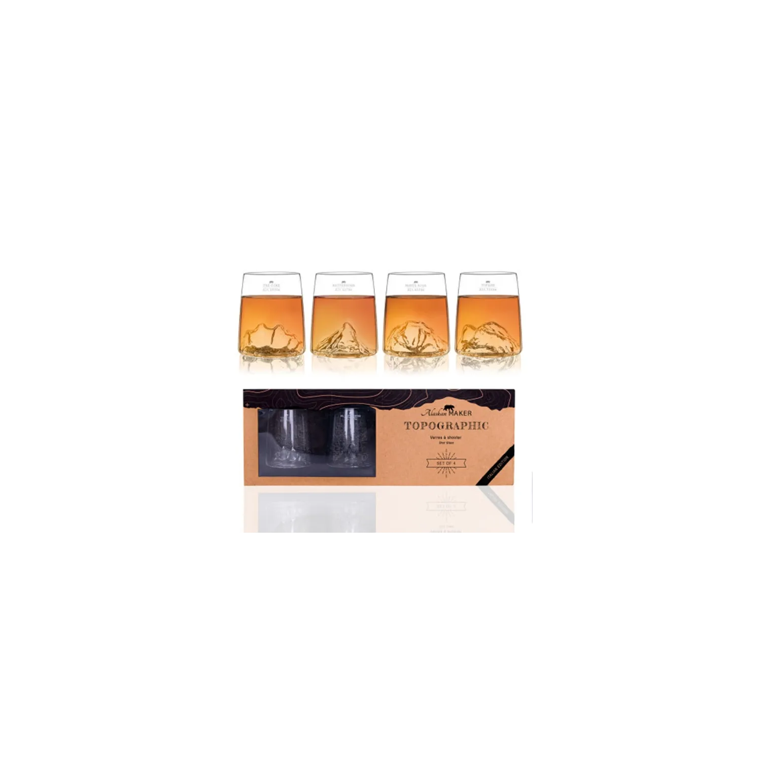 Rendi le tue serate memorabili con i nostri occhiali da tiro TOPOGRAPHIC. 4 destinazioni in un unico pacchetto. Crea le tue creazioni più belle e lascia che le montagne li subliminino per una vetta. Ogni bicchiere di colpo ha una capacità di 6,5 cl, in modo da poter gestire la quantità come si desidera. Un successo garantito con dilettanti ed epicurei allo stesso modo.