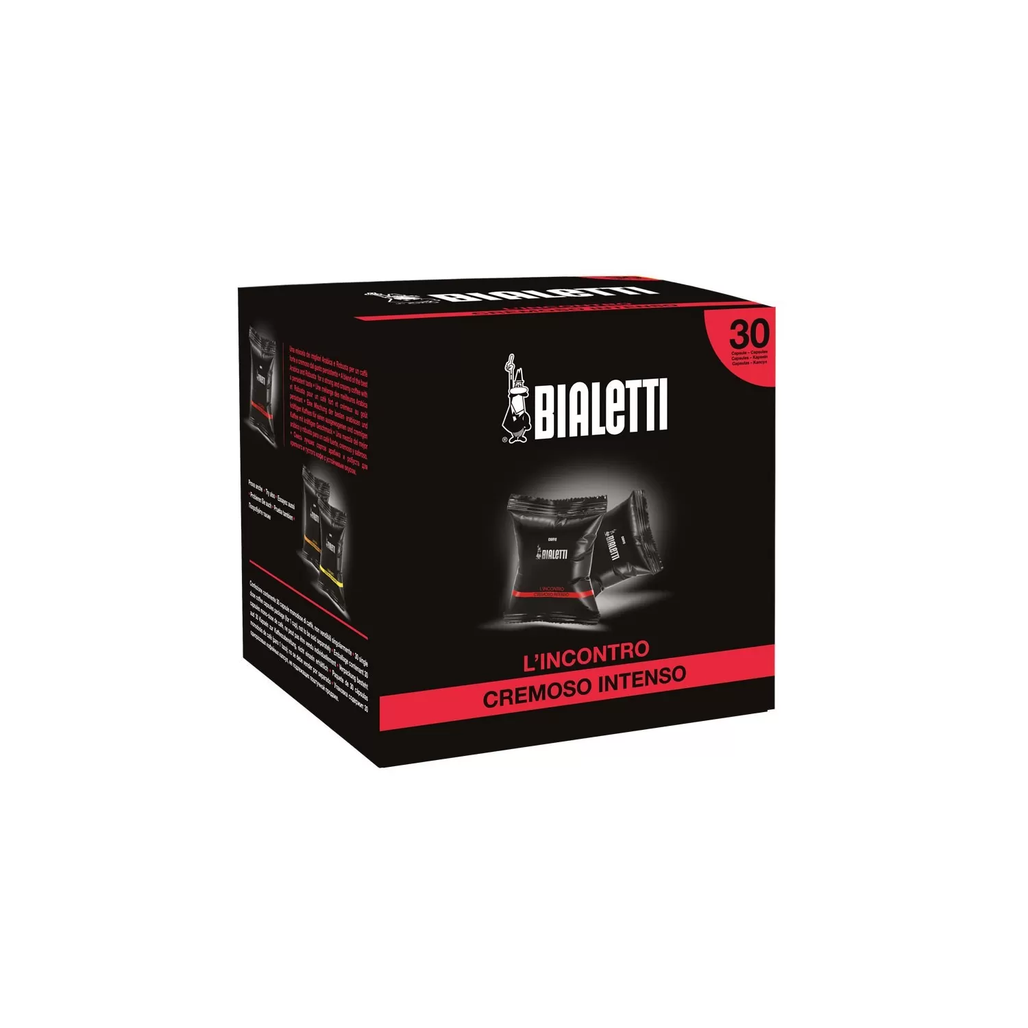 Confezione da 30 capsule L'Incontro, Cremoso Intenso. Il primo caffè non si scorda mai. In tre gusti semplici ed essenziali, le capsule standard Bialetti raccontano i primi passi di Bialetti nel mondo del caffè. Caratterizzate da un innovativo materiale plastico per mantenere la freschezza degli aromi, le capsule Bialetti standard nascono per funzionare con le macchine Bialetti trivalenti di prima generazione.
