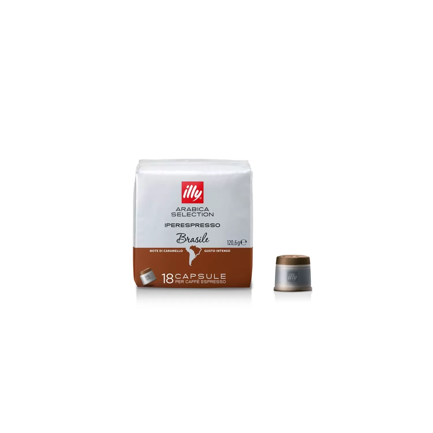 illy: Confezione da 18 capsule illy, Caffè Monoarabica Brasile. Le capsule "Brasile". Laroma è intenso e avvolgente, il corpo pieno e vellutato regala un autentico piacere tattile. Una dolcezza particolare e una decisa nota di cioccolato sono arricchite da sentori di caramello e pan tostato.