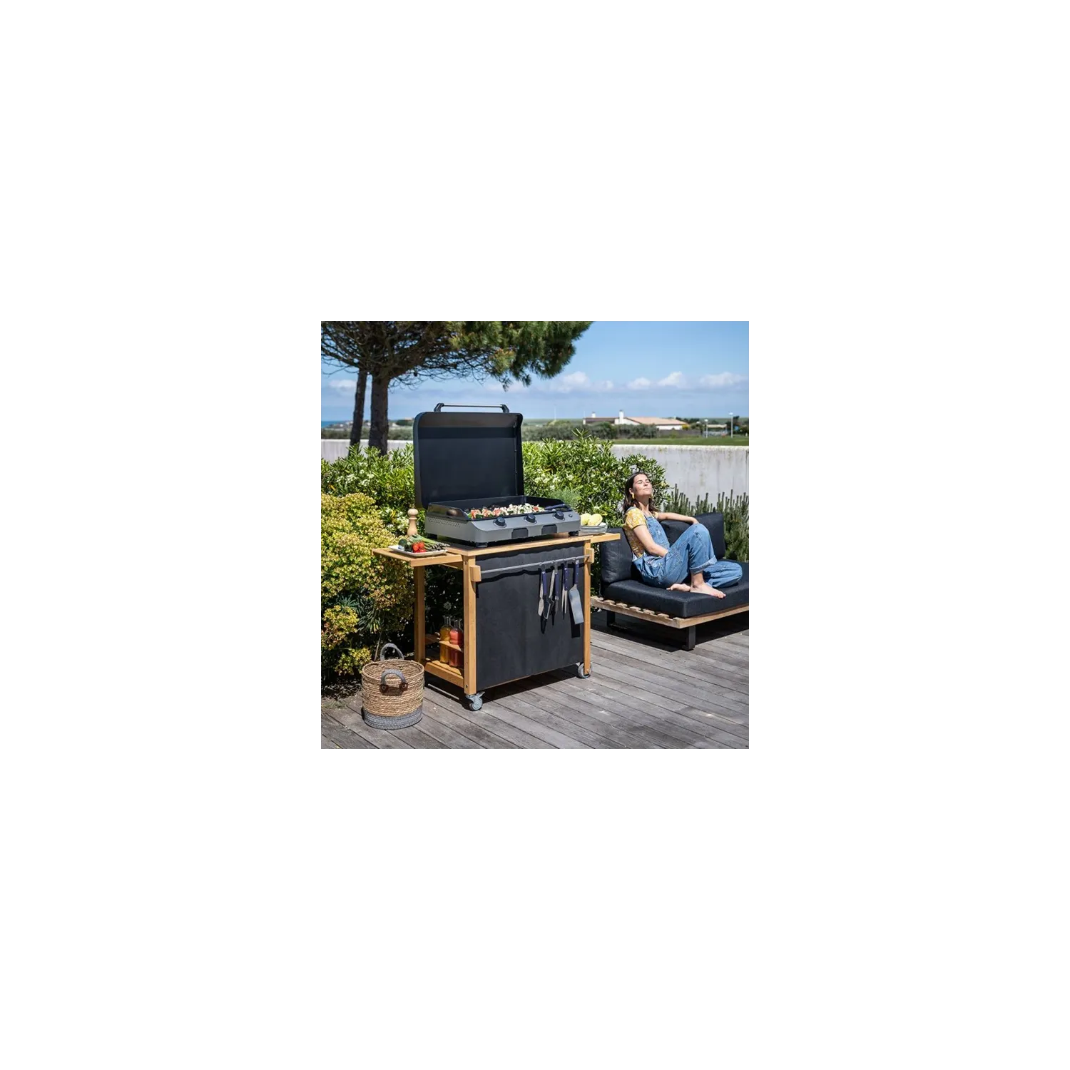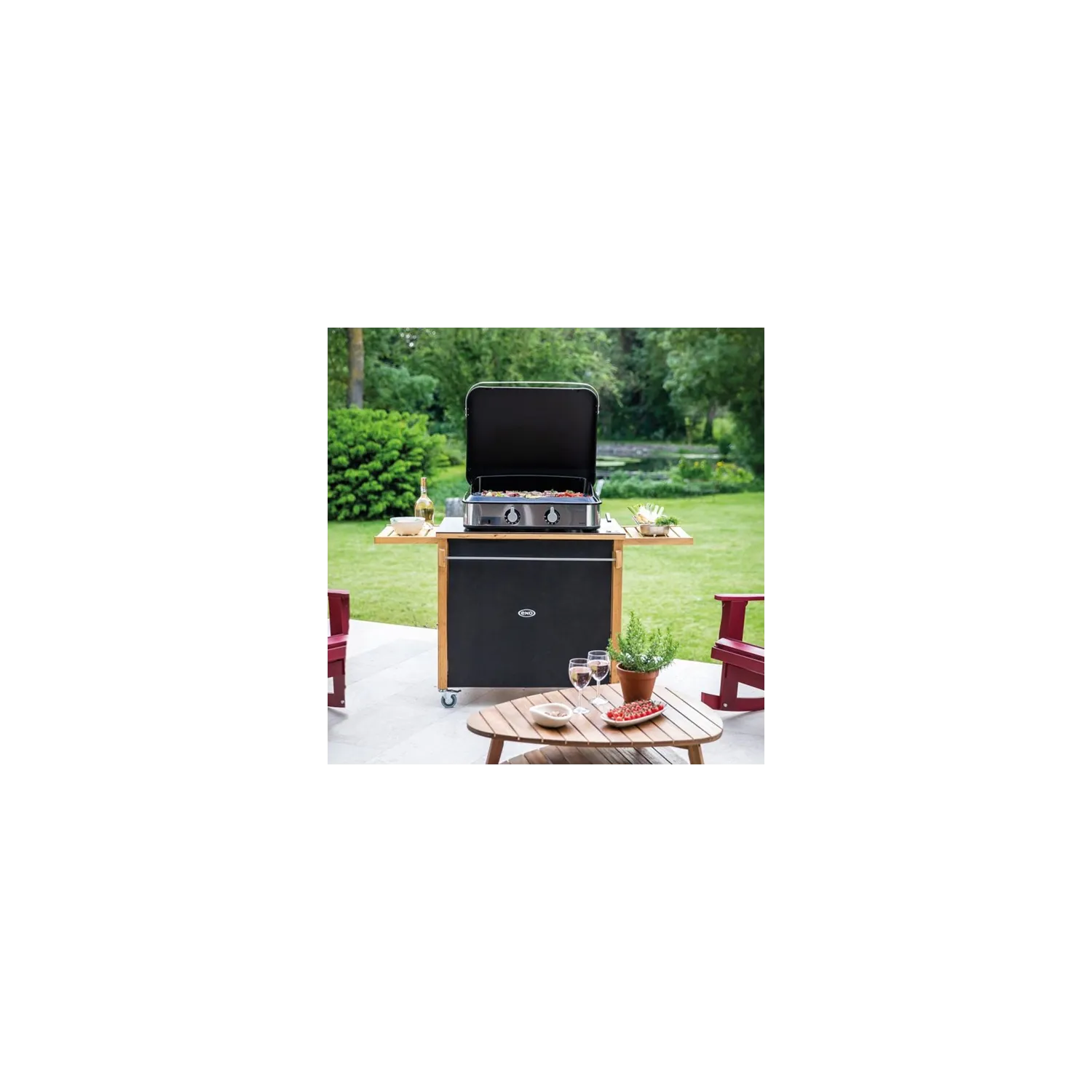 Il carrello in legno Emile è sedotto dal suo design elegante e senza tempo. Con le sue linee pulite e l'attenta finitura, porta un tocco di calore al suo spazio abitativo esterno.Il suo design in legno resistente alla marciume lo rende resistente agli agenti atmosferici e all'umidità. Supporta una plancha 2 lampade in piena stabilità. Dotato di ruote robuste e direzionali, può essere facilmente spostato da un luogo all’altro, facilitando così il servizio e la pulizia. I suoi ripiani scorrevoli offrono un generoso spazio di archiviazione per cucinare e le 2 tende uno spazio di archiviazione discreto della bombola a gas. La barra del gancio di lavagna rende possibile sospendere i suoi utensili plancha.Il carrello Emile è adatto a tutti gli esterni. Una copertura nera opzionale la protegge e ne prolunga la durata della vita.