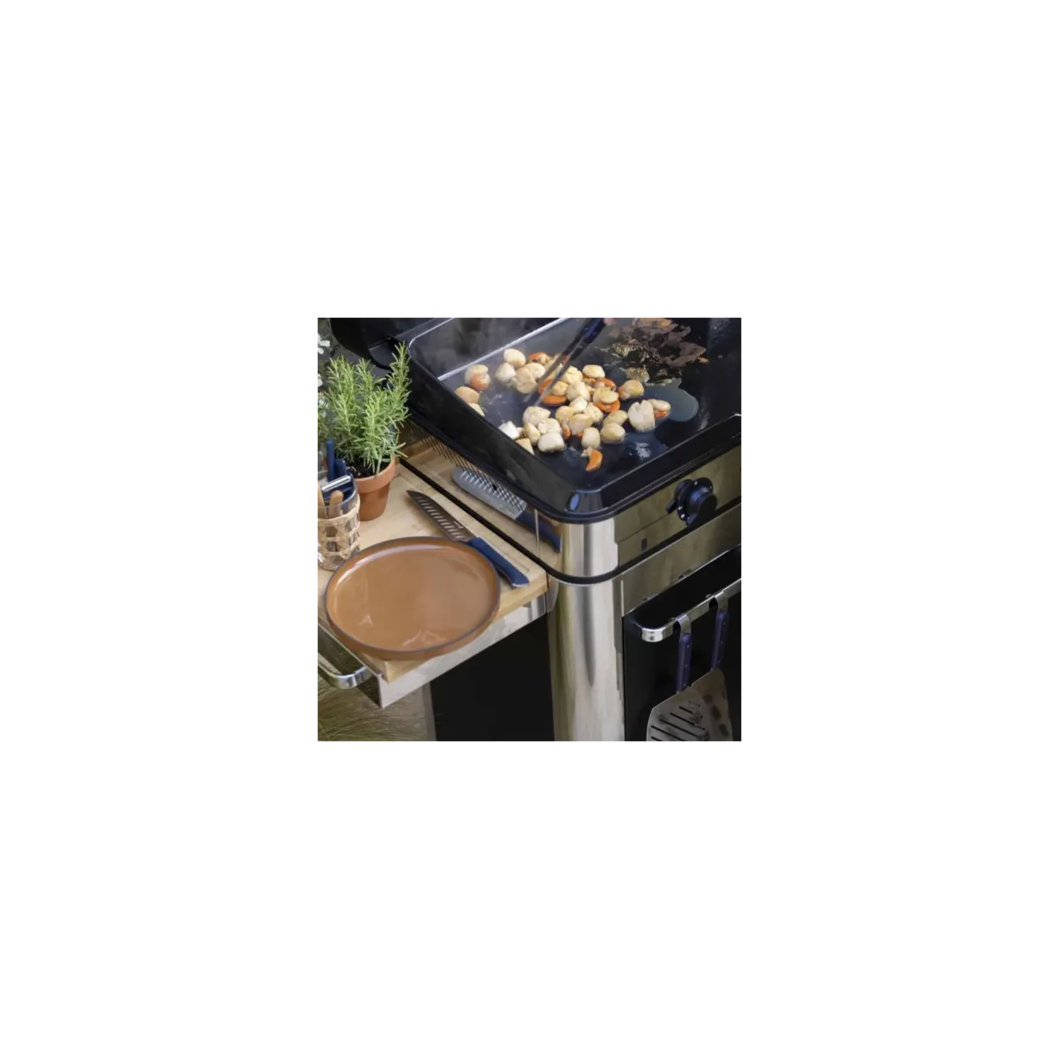 Il plancha in acciaio inox offre una generosa superficie di cottura in ghisa smaltata facile da pulire, garantendo una distribuzione uniforme del calore per ottenere risultati di cottura ottimali. I suoi bruciatori ad alta efficienza consentono una cottura precisa e rapida. Dotato di uno spazio per la bombola a gas, il carrello è dotato di una barra di sospensione per utensili e ripiani pieghevoli per facilitare la preparazione. La copertura extra piatta integrata offre una protezione efficace.
