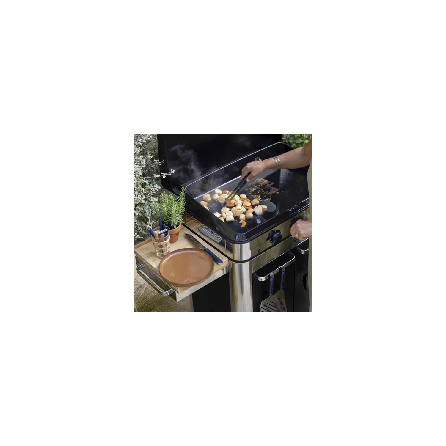 Il plancha in acciaio inox offre una generosa superficie di cottura in ghisa smaltata facile da pulire, garantendo una distribuzione uniforme del calore per ottenere risultati di cottura ottimali. I suoi bruciatori ad alta efficienza consentono una cottura precisa e rapida. Dotato di uno spazio per la bombola a gas, il carrello è dotato di una barra di sospensione per utensili e ripiani pieghevoli per facilitare la preparazione. La copertura extra piatta integrata offre una protezione efficace.
