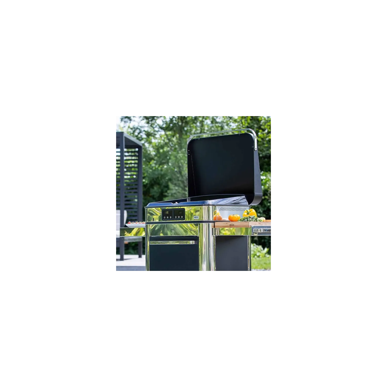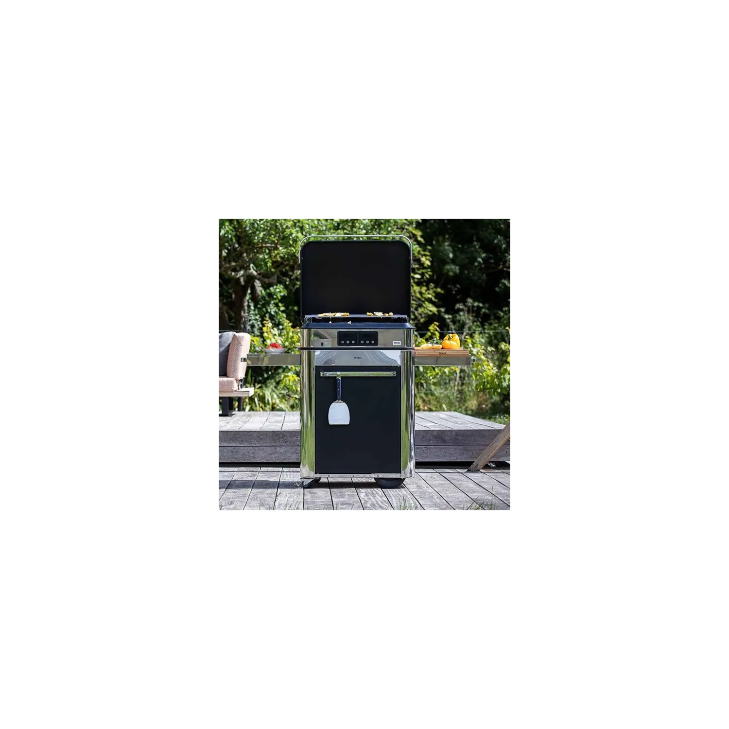 Scopri il nuovo carrello in acciaio inox. Con la sua esperienza nella vela, Eno ha scelto per il carrello l’unico acciaio inossidabile marino che resiste alla nebbia salina. I ripiani di stoccaggio, la barra di sospensione per gli utensili e le compresse pieghevoli facilitano la preparazione. Con ruote all-terrain, il carrello si muove facilmente all'aperto. Per i pasti con la famiglia o gli amici, offre un'esperienza culinaria eccezionale e una comodità senza pari.Consegnato pre-assemblato.