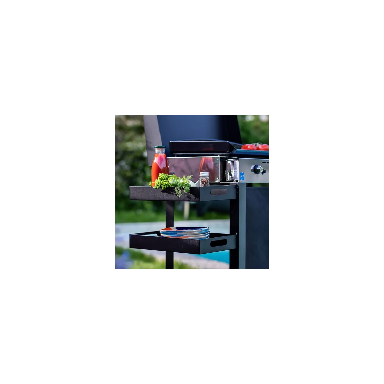 L'originale plancha a gas a 3 fuochi su un carrello d'acciaio è un set ideale per la sua terrazza o giardino. Facile da spostare con le sue 2 ruote, la combinazione è compatta e leggera. Offre una reale facilità d'uso per la cucina plancha per tutta la famiglia. L'acciaio zincato della struttura è stato sottoposto a un trattamento rinforzato per durare e resistere alla corrosione.I 2 ripiani rimovibili fungono da piano di lavoro o vassoio per posizionare le lenti per l’aperitivo. Pertanto, è possibile correggerne diverse sulle parti laterali del carrello e organizzare il suo servizio in base alle sue esigenze. La tenda permette di nascondere la bombola.Disponibile in larghezza minore, la combinazione iniziale 65 può essere dotata di una copertura (opzionale) per una protezione efficace.