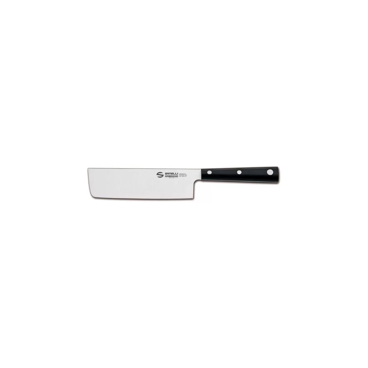 Coltello professionale in stile giapponese. Lama in acciaio inossidabile speciale all'azoto NITRO B x50CrMoV15, con eccezionale resistenza alla corrosione e durezza 57-59 HRC. Manico nero in resina acetalica (POM), antiurto ed igienico, resistente al lavaggio in lavastoviglie. Coltello affilato da un solo lato (destro), come da tradizione Giapponese.