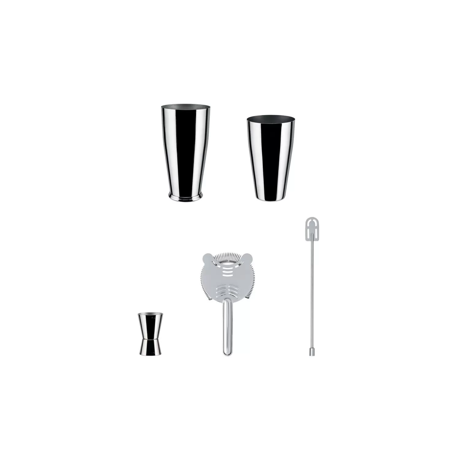 Set shaker boston inox. Set composto da: agitatore americano o "Boston", passino da bar, frullino da bar e misurino per cocktail in acciaio inossidabile 18/10 - Alessi.