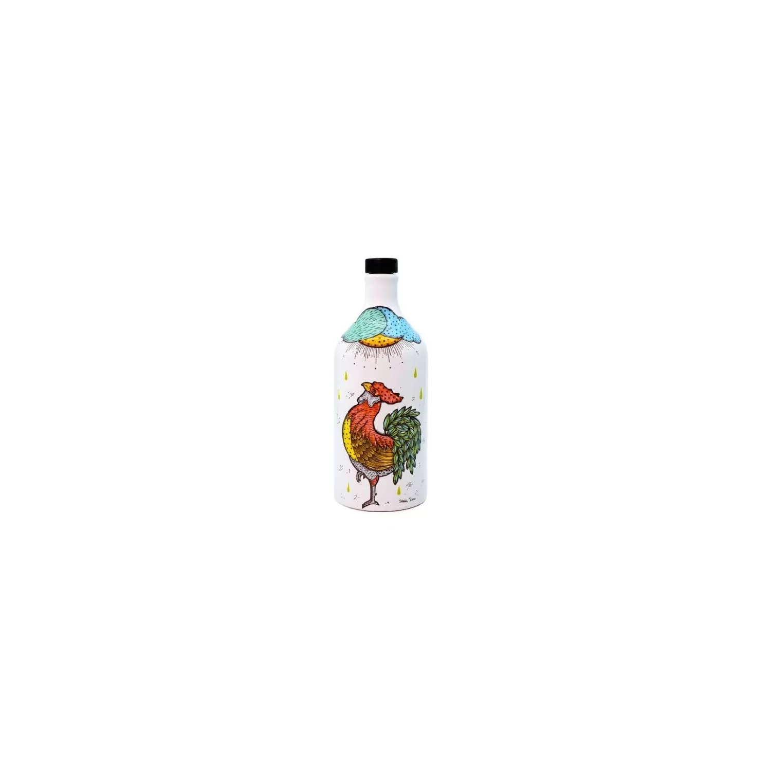 Il gallo di Stella Tasca, designer nota per il suo stile e i suoi colori accesi, diventa un animale floreale, come lei stessa lo definisce: un lampo di luce, sole e colore, fiero come chi trova una nuova via, proteso verso una nuova strada. La sua coda rievoca e celebra lulivo, altro simbolo per eccellenza dellidentità pugliese, legandosi così ancora di più al territorio e al prodotto che lorcio in terracotta per olio racchiude e protegge: le piume del gallo diventano foglie dulivo, e quindi vita stessa.