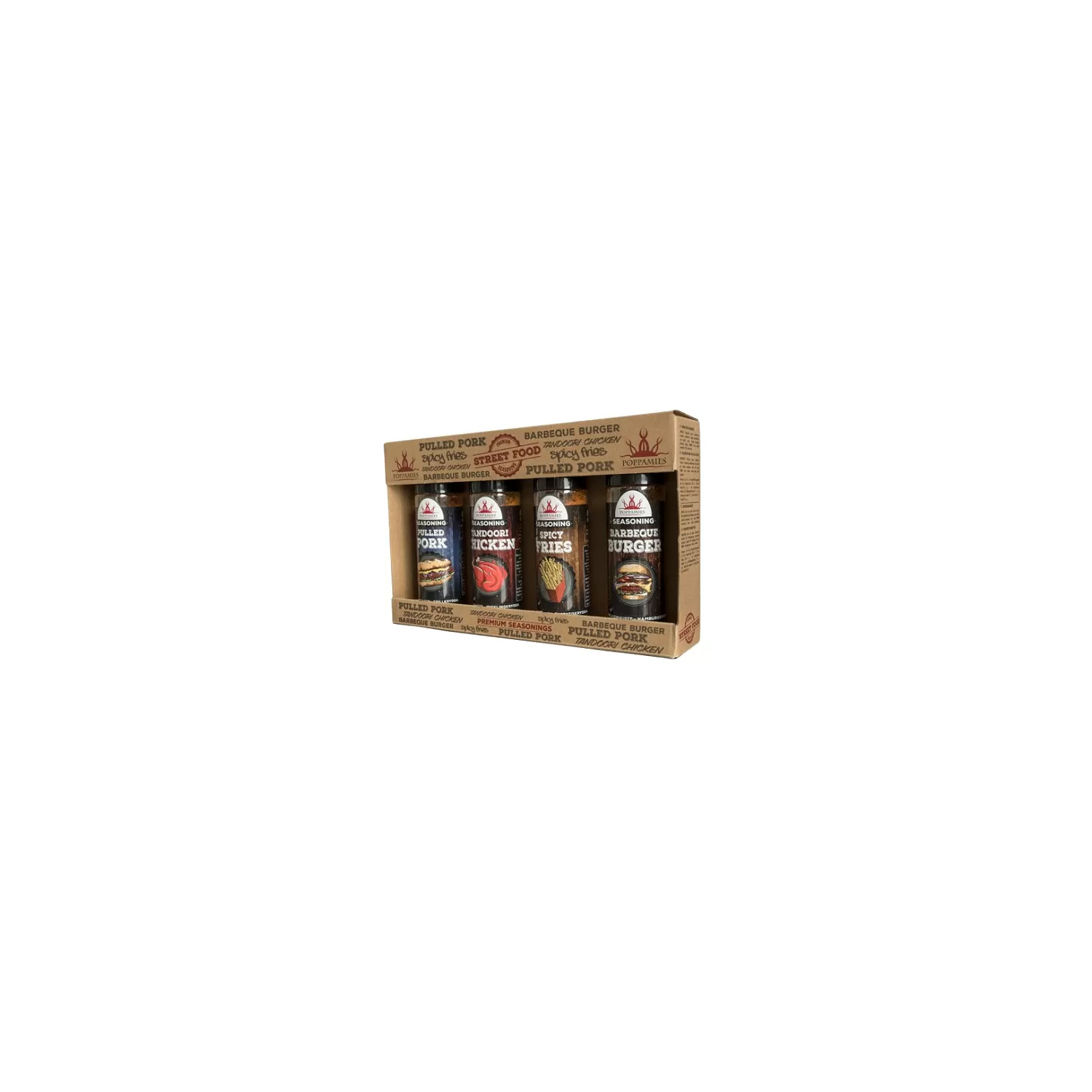 Formato: condimento per patatine piccanti 120 g, condimento per maiale sfilacciato 110 g, condimento per hamburger barbecue 110 g, condimento per pollo Tandoori 100 g.