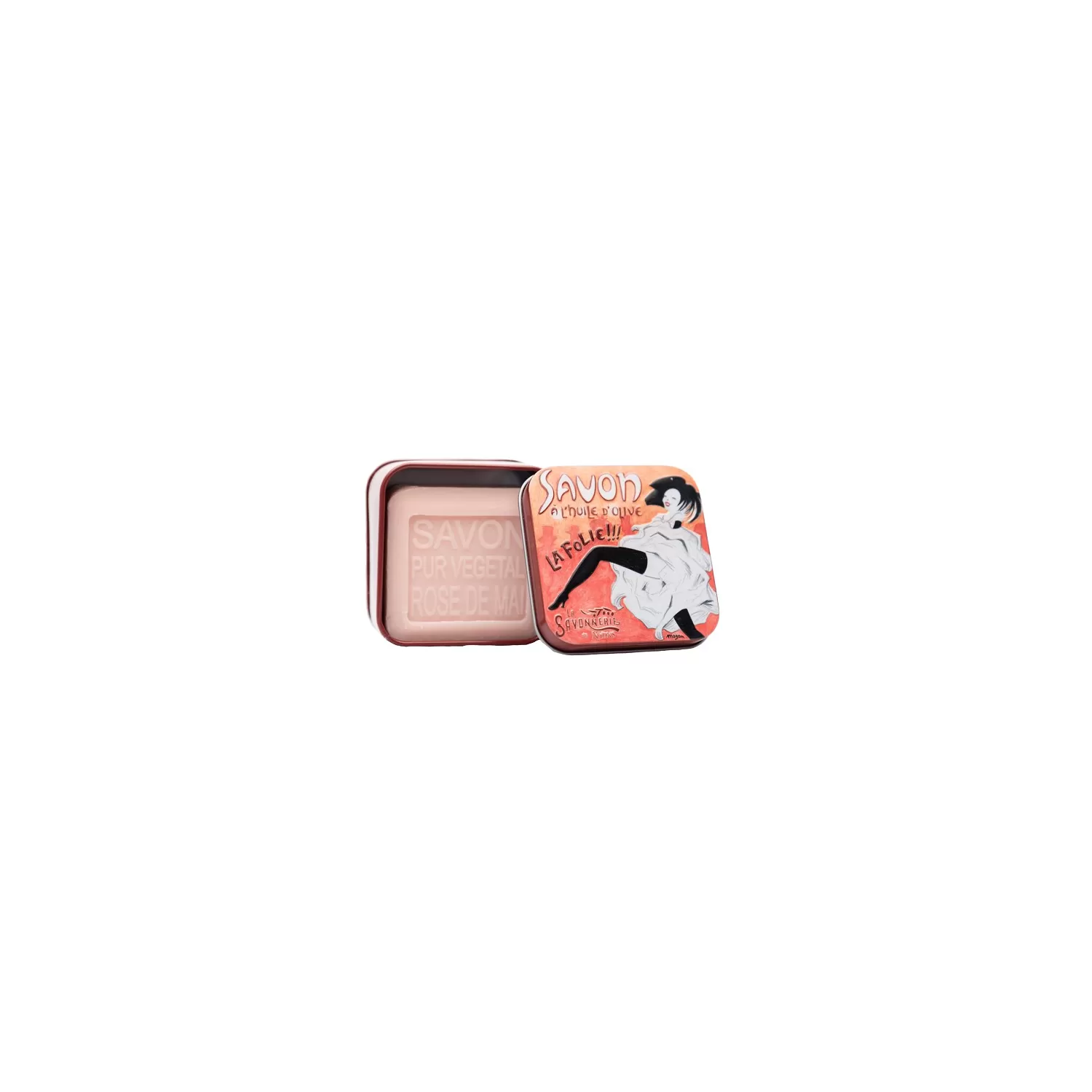 Sapone da 100 g profumato alla rosa di maggio e la sua scatola di metallo "La Folie".
