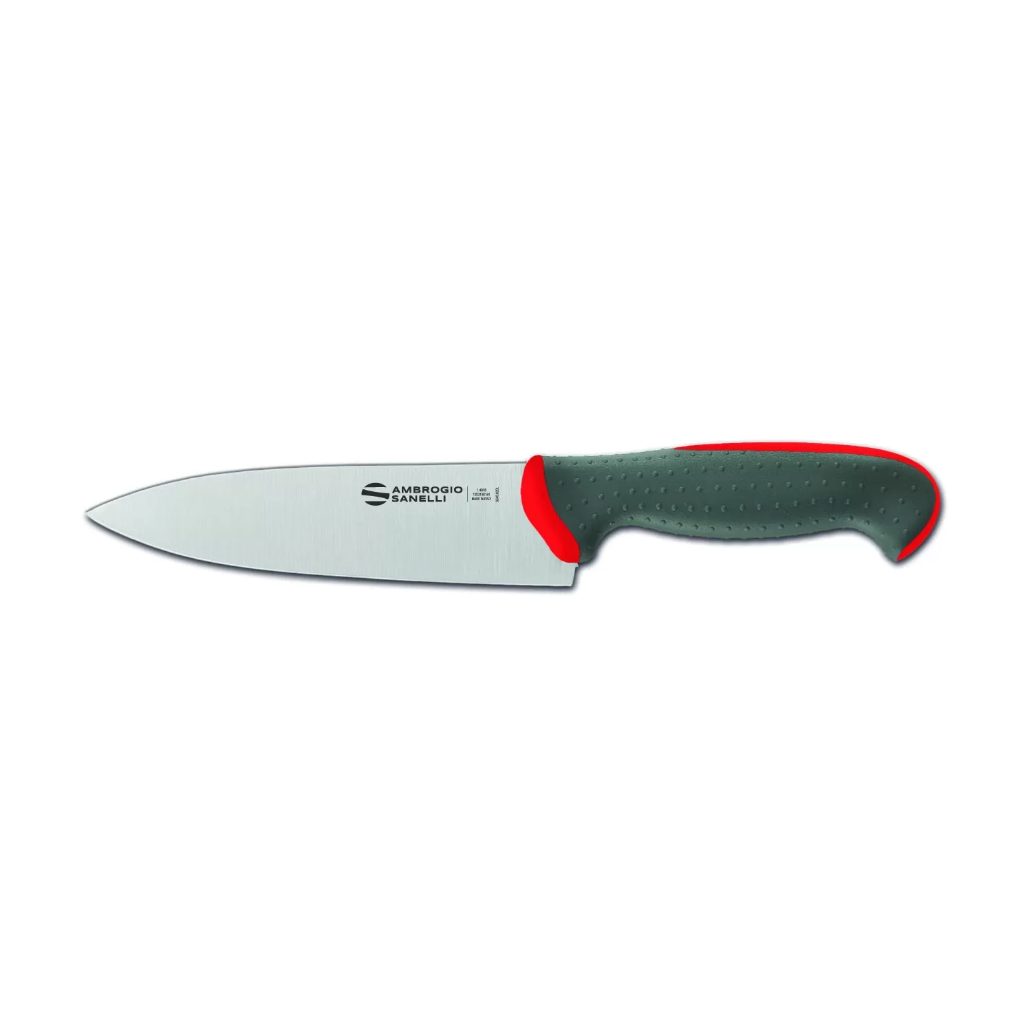Nuova linea di coltelleria professionale con manico a doppio stampaggio e lame in acciaio inossidabile al cromo, molibdeno e vanadio X50CrMoV15. Il manico è costituito da unanima interna in materiale plastico rigido ed indeformabile, unito con la massima sicurezza al codolo di acciaio, e da un rivestimento esterno più morbido in gomma termoplastica. I due materiali aderiscono perfettamente in modo da formare un corpo unico al tatto. La parte più esterna, di colore grigio, è inoltre stata progettata con micro-sfere che ne esaltano lergonomia, limitando la scivolosità e favorendo il comfort. Tutti i materiali utilizzati sono atossici, sterilizzabili, adatti al lavaggio in lavastoviglie, resistenti alle alte e basse temperature e conformi alle normative vigenti in tema di igiene e sicurezza alimentare.