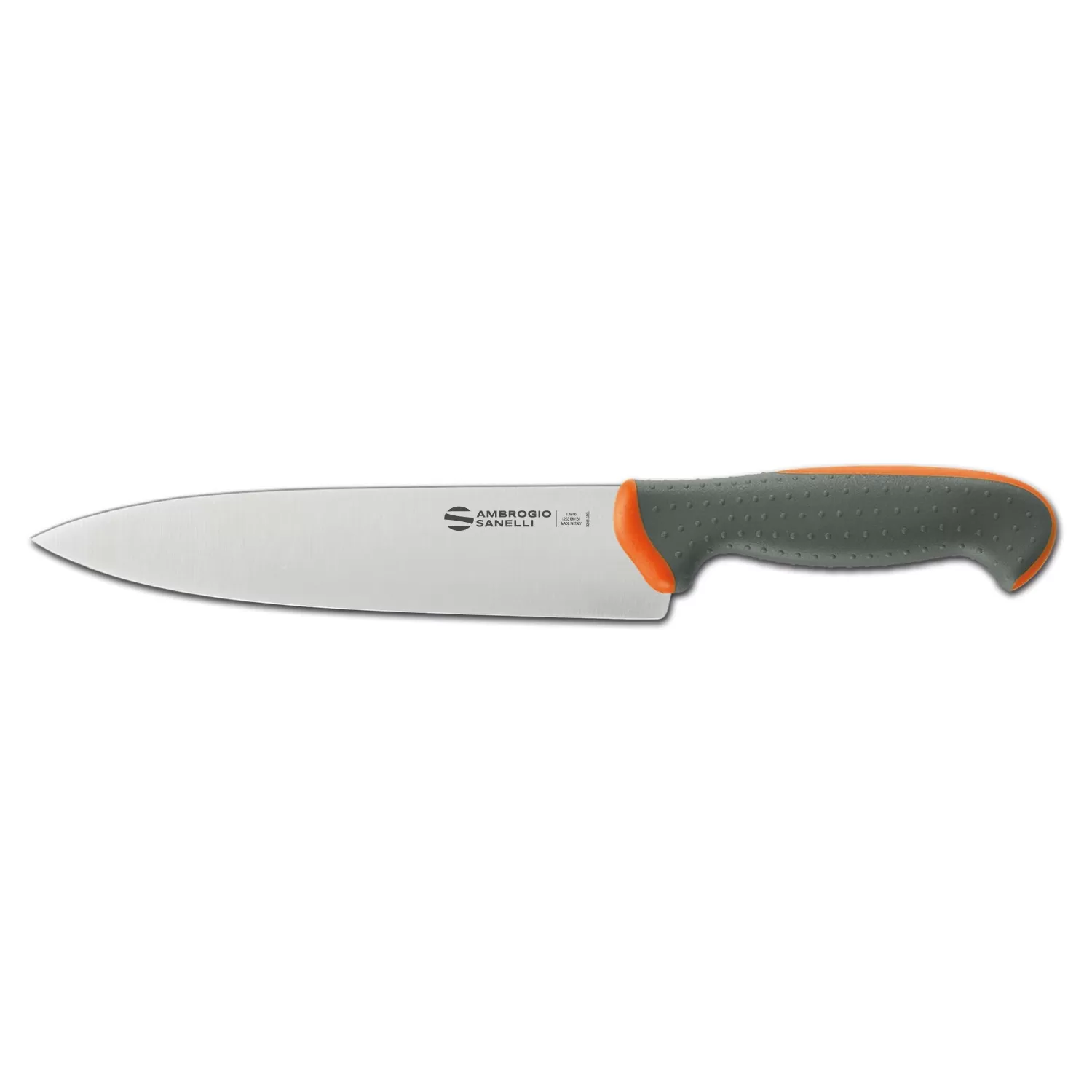 Nuova linea di coltelleria professionale con manico a doppio stampaggio e lame in acciaio inossidabile al cromo, molibdeno e vanadio X50CrMoV15. Il manico è costituito da unanima interna in materiale plastico rigido ed indeformabile, unito con la massima sicurezza al codolo di acciaio, e da un rivestimento esterno più morbido in gomma termoplastica. I due materiali aderiscono perfettamente in modo da formare un corpo unico al tatto. La parte più esterna, di colore grigio, è inoltre stata progettata con micro-sfere che ne esaltano lergonomia, limitando la scivolosità e favorendo il comfort. Tutti i materiali utilizzati sono atossici, sterilizzabili, adatti al lavaggio in lavastoviglie, resistenti alle alte e basse temperature e conformi alle normative vigenti in tema di igiene e sicurezza alimentare.