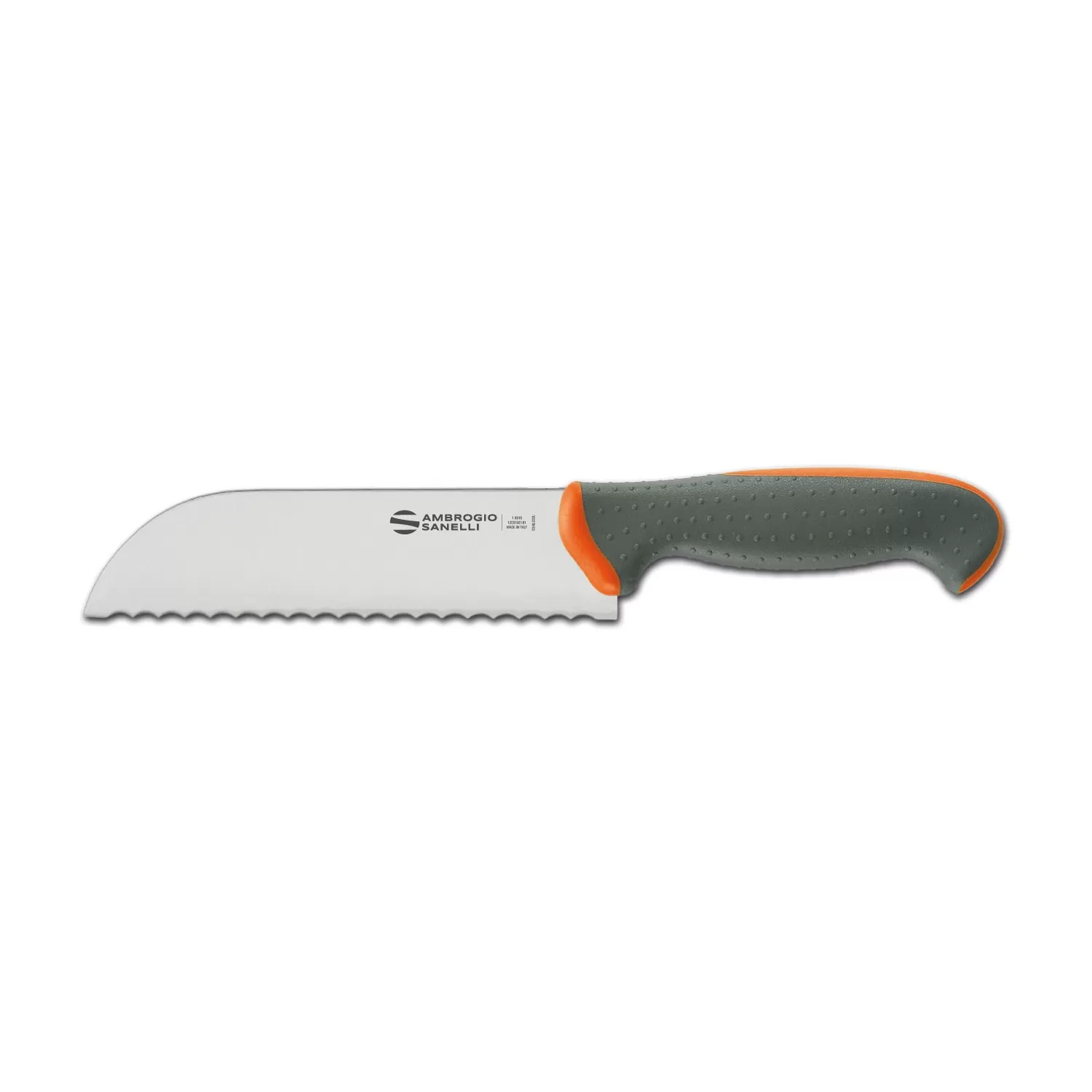Nuova linea di coltelleria professionale con manico a doppio stampaggio e lame in acciaio inossidabile al cromo, molibdeno e vanadio X50CrMoV15. Il manico è costituito da unanima interna in materiale plastico rigido ed indeformabile, unito con la massima sicurezza al codolo di acciaio, e da un rivestimento esterno più morbido in gomma termoplastica. I due materiali aderiscono perfettamente in modo da formare un corpo unico al tatto. La parte più esterna, di colore grigio, è inoltre stata progettata con micro-sfere che ne esaltano lergonomia, limitando la scivolosità e favorendo il comfort. Tutti i materiali utilizzati sono atossici, sterilizzabili, adatti al lavaggio in lavastoviglie, resistenti alle alte e basse temperature e conformi alle normative vigenti in tema di igiene e sicurezza alimentare.