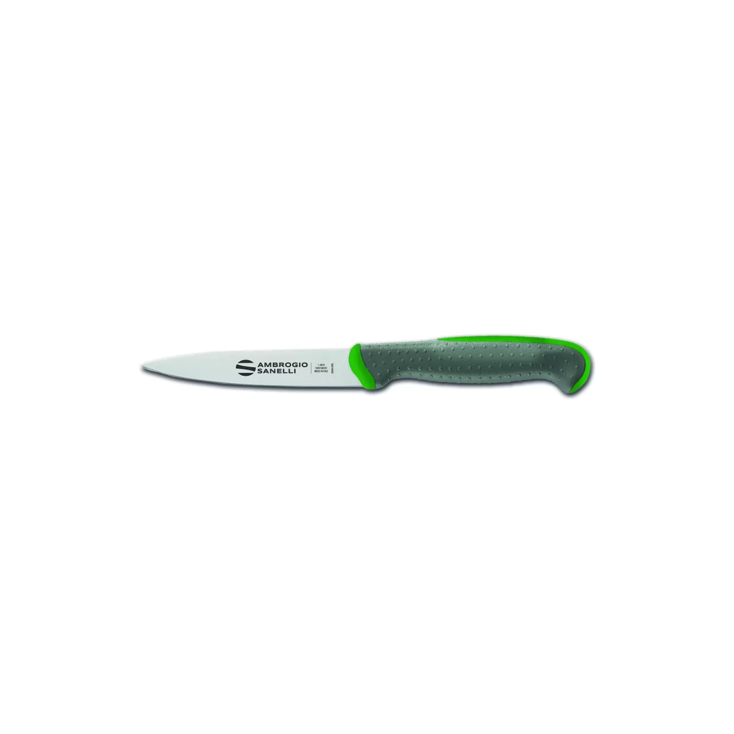 Nuova linea di coltelleria professionale con manico a doppio stampaggio e lame in acciaio inossidabile al cromo, molibdeno e vanadio X50CrMoV15. Il manico è costituito da unanima interna in materiale plastico rigido ed indeformabile, unito con la massima sicurezza al codolo di acciaio, e da un rivestimento esterno più morbido in gomma termoplastica. I due materiali aderiscono perfettamente in modo da formare un corpo unico al tatto. La parte più esterna, di colore grigio, è inoltre stata progettata con micro-sfere che ne esaltano lergonomia, limitando la scivolosità e favorendo il comfort. Tutti i materiali utilizzati sono atossici, sterilizzabili, adatti al lavaggio in lavastoviglie, resistenti alle alte e basse temperature e conformi alle normative vigenti in tema di igiene e sicurezza alimentare.