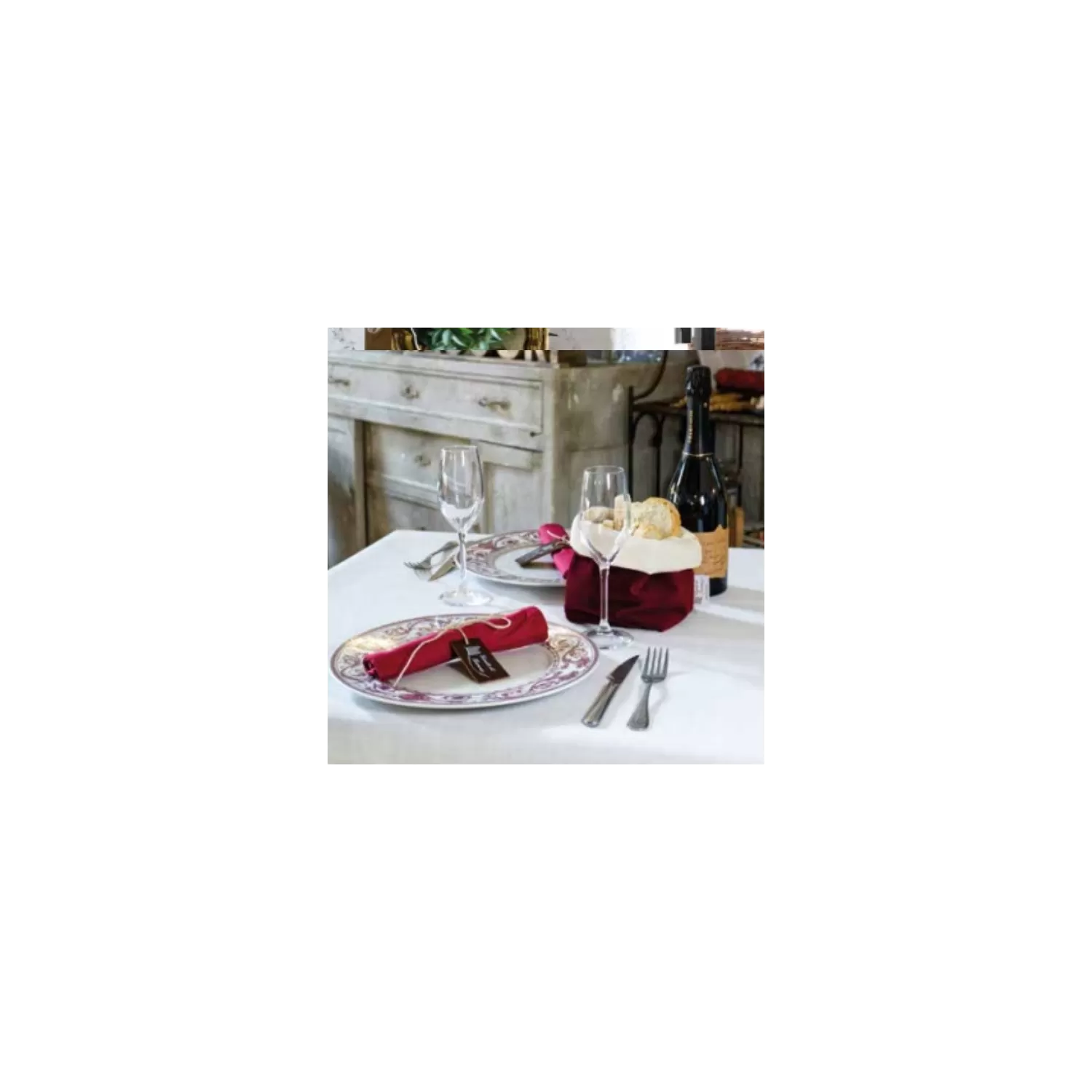 È esaltato da lutilizzo di stoviglie sobrie in colori neutri, ma per una mise en place di maggior impatto si possono utilizzare anche stoviglie e bicchieri colorati, meglio in tinta unita o comunque in linea con la decorazione. Labbinamento è perfetto con i tovaglioli in cotone coordinati, disponibili in molti colori che si sposano perfettamente con il decoro.