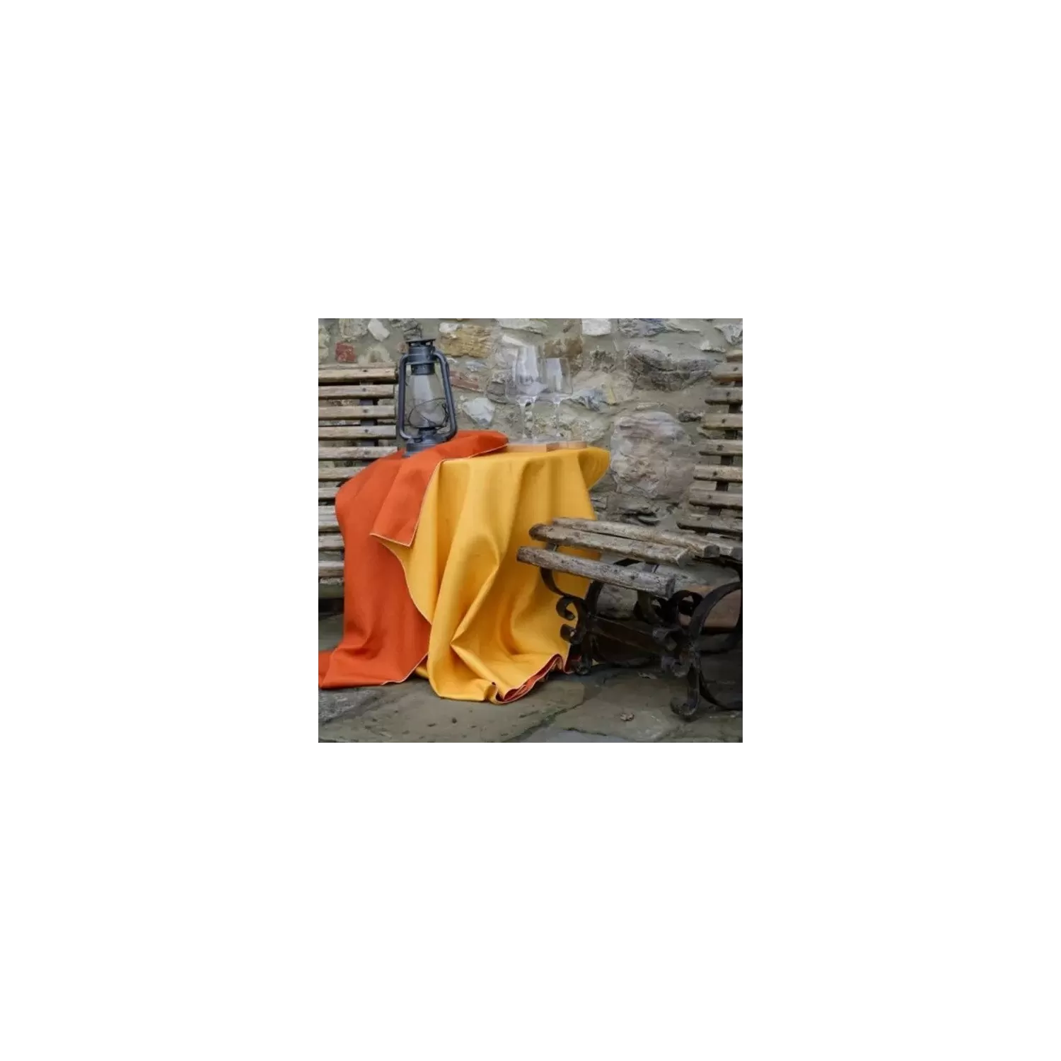 La tovaglia è realizzata in un particolare tessuto tecnico nuvola (prodotto da WOSDE) interamente in Toscana, è antimacchia e antipiega.